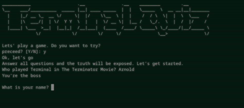 The game was originally constructed to give a secret key for users to post on Discord, so the code do the same it generates a secret key that the user can copy and share somewhere, he needs to get instructions on what to do with the code. When he answered all the questions, he will be asked for a name and that name will be saved in CSV file, that can be accessed via FTP.